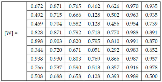 Each figure has two sections, (a) and (b). In the sections (a) graphics with training and validation results over time, based on configured epochs/iterations, are presented. On the horizontal axis, the number of epochs and iterations are marked, while on the vertical axis, the accuracy and loss are marked. Blue color and red colors represent the accuracy and loss applied for the training dataset, while black represents the accuracy and loss applied for the validation dataset. Sections (b), for each figure, represent the confusion matrix obtained for individual networks on 70% of randomly selected images from the HAM10000, part 2, dataset. Basically, from the confusion matrix, we can determine the behavior in terms of the final prediction, for each network, and for each class to implement the [W] matrix. We will further use the information from each confusion matrix in our proposed system. After applying (1) to the results obtained for each confusion matrix (based on the testing dataset), we obtained the weight matrix presented in Figure 17. The same information could be found directly in the confusion matrix. Table 3 presents the accuracy obtained during training and validation phases, together with the percentage of the correct classification obtained for each of the classes during the establishing [W] phase.