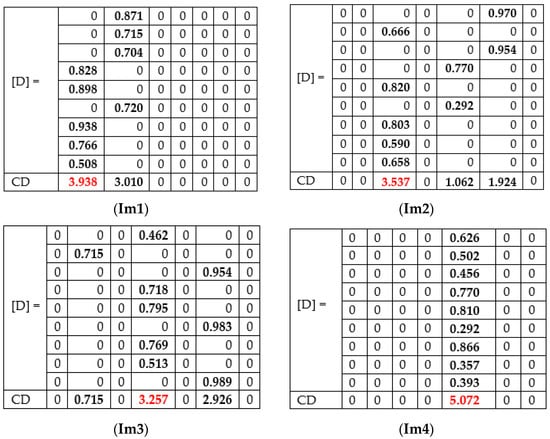 Examples of experiments on four randomly selected images (Im 1, Im 2, Im 3, and Im 4) are presented in Table 4. The final decision taken by CDB is based on Decision matrix D, which is calculated for each input image (Figure 18). The decision is taken if CD is at a maximum (red color).