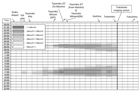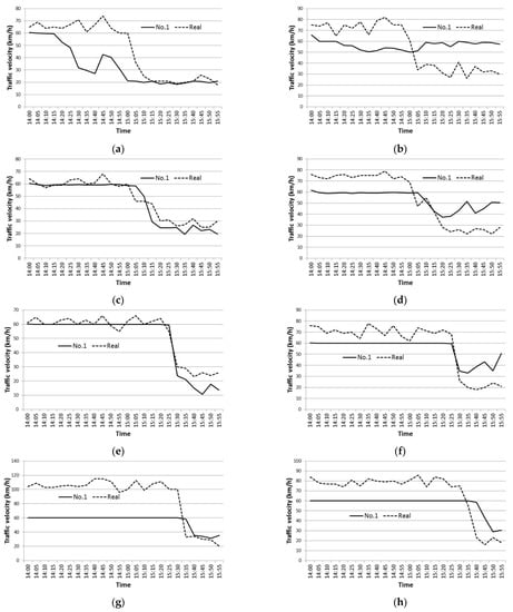 From Figure 6a, traffic velocity begins to decrease at the a-1 detector location at around 3.00 pm, similar to real traffic-data behaviour, although there seems to be a temporary reduction in velocity at about 2:30pm. Then, at around 3 pm, the traffic congestion begins to spread over the downstream link. The simulated timing of the speed reduction concurs with that of the real traffic data. Therefore, this simulation seems to be reproducing the real traffic flow accurately. As seen from Figure 6g–i, traffic congestion reaches a distance of 4.7 km, but does not quite reach the Toyonaka junction. Hence, the simulated congestion level seems to be a little lower compared to the real traffic data.