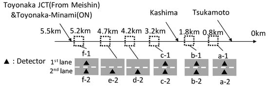 The length of the modelled network was 5.5 km and began at the Tsukamoto merging section and ended around the Toyonaka junction. The network had 10 detectors (a-1 to f-2) to compare the simulation results to the real traffic data. Therefore, it was possible to use the add-on modules in this study (Figure 4). One of the advantages of using the VISSIM model is being able to use other driver models.