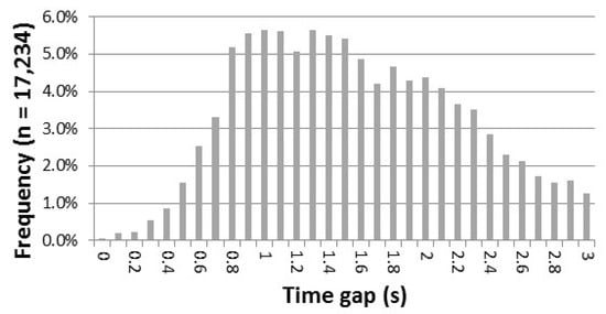 The length of the study section of the network was 5.5 km and spanned from the Tsukamoto merging section to around the Toyonaka junction (Figure 3). The network had 10 detectors (a-1 to f-2) to compare the simulation results to the real traffic data. Figure 4 shows the histogram of the time gap that was composed of values under 3 s. The mean value of the distribution was 1.55 s. The time-gap distribution came from vehicle-trajectory data, which were created using video-image data around the Tsukamoto merging section. The details of the vehicle-trajectory data can be seen on the ZTD (Zen Traffic Data) website [24].