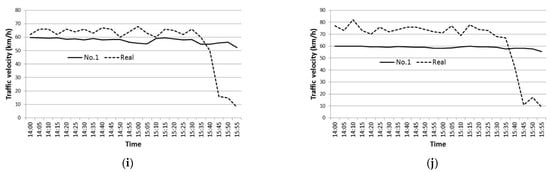 As discussed, the network had ten detectors (a-1 to f-2) that were used to compare the simulation results to the real traffic data. The result of case No. 1 compared to the real traffic data is discussed in this section. Figure 6a–j show the simulation results of traffic velocity compared with the real traffic data. The results were obtained by averaging three out of five possible results, excluding both the best and worst results. In this simulation, the maximum velocity was set at 60 km/h, which exhibited differences from the observed real maximum traffic velocity, which in some cases reached 80 km/h and 100 km/h in the 2nd lane. It should be noted that the maximum velocities in the 1st lane were observed to be lower than in the 2nd lane. Traffic congestion patterns in both lanes were similar, however, with congestion beginning around 3 pm, then reaching the Kashima on-ramp after 30 min, before reaching the Toyonaka junction around 4 pm.