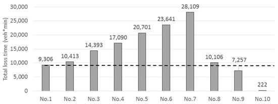 The reason for these results is that the assigned average desired time gap of autonomous vehicles was around 1.7 s, which was longer than the value of the non-autonomous-vehicle desired time gap of 1.55 s. Moreover, the autonomous-vehicle speed recovery after the speed reduction was slower than a non-autonomous vehicle because the maximum acceleration of the autonomous vehicle was set as 0.6 m/s2. These two parameters doubly affected the level of the resulting congestion in the network. Changing the values of the parameters will result in changing results. For example, the maximum-acceleration value was changed to 1.4 m/s2 from 0.6 m/s2 in case No. 8. With 25% of the fleet being AVs, which is similar to case No. 5, the loss time was much lower than in case No. 5. In fact, it was the same value as that calculated for case No. 1. Interestingly, the maximum-acceleration value of 1.4 m/s2 is the same parameter used in the IDM+.