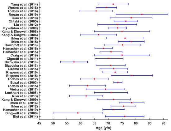 Thirty papers reported the gender of participant groups. Terrier and Reynard [43] and Reynard and Terrier [54] had an equal number of both male and female participants, while Bizovska, Svoboda [9] and Kyvelidou, Kurz [47] included only female participants (Table 1). Generally, in most of the studies, female participants were more prevalent than male [3,7,9,31,34,35,36,38,39,42,45,51,52,53,56,59,61]. The average age range for older participants were 70.6 ± 6 (65–76.2) years old (Figure 2) and 25 ± 5 (20–30) years old for younger participants [3,6,7,27,28,29,31,33,40,41,42,43,48,52,53,54,55,56,57,58,62].