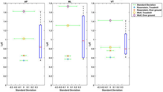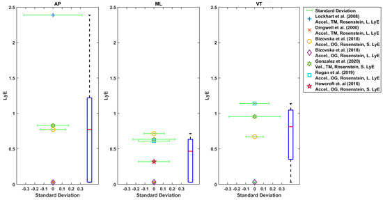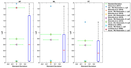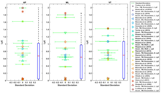 The boxplot of LyE values for healthy older adults estimated using Rosenstein’s or Wolf’s method is shown in Figure 6. Some studies used acceleration, and some used velocity of the trunk. The median values for LyE were 0.67 (18 values), 0.64 (20 values) and 0.69 (17 values) for AP, ML and VT directions, respectively (Figure 7).