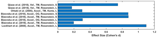 Twenty-one studies used Rosenstein’s method [3,6,9,27,28,31,33,34,37,38,39,40,41,42,43,46,49,50,52,53,54,55,60,61,63]. One study used Kant’s method [48]. Two studies used Rosenstein’s and Kantz’s methods together [40,44]. One study used Rosenstein, Kant and Ihlen methods [29]. In three studies Wolf’s method was used [4,38,58]. In one study, Rosenstein’s and Wolf’s methods were used [57]. Rispens, Van Dieën [57] showed different values of LyE estimation using Rosenstein’s method and Wolf’s method (Figure 3). In some studies, short term LyE was estimated [3,7,36,40,57,65] or both short and long terms were estimated [6,30,33,41,43,55,56,62]. Finally, max LyE or finite time LyE were estimated [7,27,33,37,42,43,47,48,52,56,57,58,61].