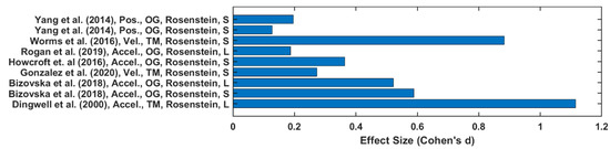 Twenty-one out of forty-five studies reported LyE value of trunk acceleration or velocity [3,9,27,28,29,30,31,33,37,38,41,42,43,47,53,54,55,56,57,59,60,61,63]. In papers reporting a YO comparison, the estimation of LyE values calculated from acceleration data produced higher effect size values on average (0.61 ± 0.39) than velocity (0.46 ± 0.4), as depicted in Figure 4. Additionally, the OG walking effect size (0.59 ± 0.4) is higher than TM walking (0.56 ± 0.39). However, in F-NF studies, LyE calculated from velocity data has been shown to produce a higher effect size value (0.58 ± 0.43) than from acceleration data (0.55 ± 0.35), as shown in Figure 5. TM walking effect size (0.76 ± 0.43) is higher than OG walking (0.37 ± 0.19).