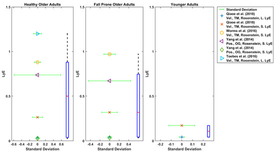 As shown in Figure 6, Figure 7, Figure 8 and Figure 9, the reported values from across all reviewed studies do not clearly distinguish between the LyE values of F-NF and YO, despite each study showing LyE higher in fallers compared to non-fallers and older versus younger adults.