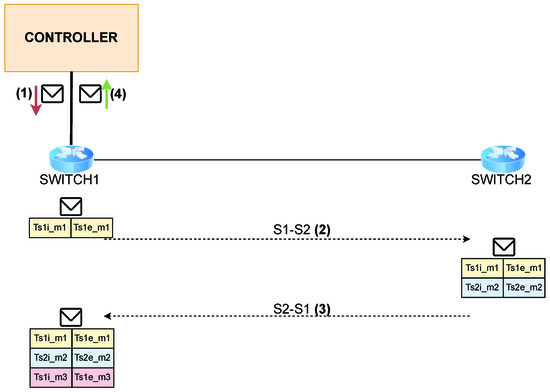 - Switch 1 adds timestamps and to the packet while forwarding it towards Switch 2.