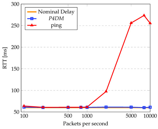 Figure 8 shows the comparison between ping and P4DM on a nominal delay of 60 ms RTT. In this case, we considered the RTT (as sum of the forward and backward delays) measured by P4DM instead of the OWD, to make it comparable with ping. This test compares the measured RTT by varying the packets per second injected in the network path. The topology analyzed is the one presented in Figure 6, using the same path considered in Section 5.3. However, to be able to perform the ping, a host was attached to s4. The chart shows how, apart from small fluctuations induced by the virtual environment, P4DM and ping perform similarly. However, after hitting the threshold of 1000 packets per second, P4DM outperforms ping by at least half the RTT. The difference between the two can be mainly advocated to the fact that P4DM is able to remove the queuing delay from the LDM measurements, as opposed to ping.