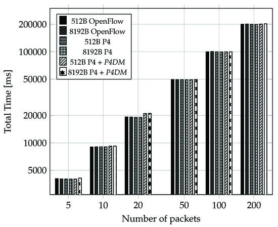 Figure 10 shows a packet transmission time comparison between switches using the different set ups. A calculation of Total Transmission Time of bursts of packets of length ranging between 5 and 200 was performed, for packet sizes of 512 Bytes and 8192 Bytes. The comparison clearly shows that providing P4 basic functionalities does not significantly degrades switches’ performances even in the scenario of switches running both P4 and P4DM. Overall, P4 does not introduce a sensitive performance overhead compared to OpenFlow.