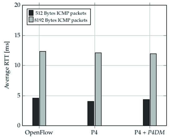 Figure 11 shows a calculation of the average Round Trip Time (RTT) to transmit a set of 512 Bytes and 8192 Bytes ICMP packets. The goal of these tests was to examine the forwarding behaviour of the different switches (OpenFlow-enabled, P4-enabled and P4DM-enabled). As expected, the histogram shows that OpenFlow performs slightly worse than P4 due to the fact that P4 only implements the minimal forwarding behaviour while OpenFlow comes with a set of default features that introduce a not negligible overhead. An important conclusion to draw out of Figure 11 is that P4DM does not affect the switch performance, since the P4 switch performs the same either with or without P4DM.