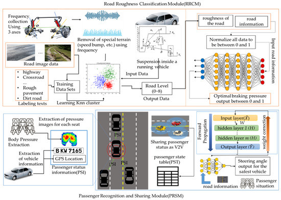 The BDDS consists of two modules, as shown in Figure 1. The road roughness classification module (RRCM) collects the pressure of the wheels while driving on the road by installing three axles on the vehicle’s suspension and classifies the roughness of the road on which the vehicle is traveling into eight levels by using the pressure. It also calculates the best brake pressure for the current road environment by using the roughness of the road and the speed of the surrounding vehicles. The passenger recognition and sharing module (PRSM) classifies the passenger status of a vehicle more accurately using a body pressure sensor. The PRSM recognizes whether an adult, child, or cargo is seated on each seat of the vehicle and stores the recognized passenger status in passenger status information (PSI) along with the vehicle’s location and vehicle number. By sharing the PSI with surrounding vehicles through V2V, the vehicle can accurately recognize the location of nearby vehicles and the status of passengers. The PRSM calculates the steering angle at which the vehicle can safely travel to its destination based on the position of the surrounding vehicles and the condition of the passengers.