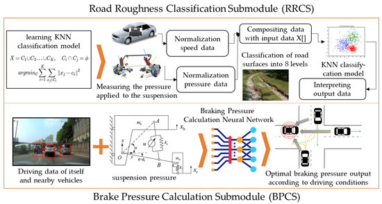 The road roughness affects various aspects of driving, such as the speed of the vehicle, the load on the suspension system, and the degree of vibration felt by passengers [25,26,27]. Knowing the condition of the road is important. Whether the road is wet or bumpy has a big impact on the vehicle’s braking distance. Especially in emergency situations, the vehicle must calculate the appropriate braking pressure according to the road conditions. Therefore, road roughness has not been considered in existing autonomous vehicles that focus on avoiding obstacles but must be considered in fully autonomous vehicles that consider both passenger condition and vehicle stability. In this work, the road roughness classification module (RRCM) was designed to calculate the optimal braking pressure in order not to lose the tire grip in various road conditions. The RRCM consists of two submodules. First, the road roughness classification submodule (RRCS) classifies the roughness of the road on which the vehicle is traveling into eight levels through K-nearest neighbor (KNN) clustering, which is one of the machine learning techniques [28,29]. Second, the brake pressure calculation submodule (BPCS) calculates the most suitable brake pressure for driving using the roughness of the road classified by the RRCS, the condition of surrounding vehicles, and the current road condition. Figure 2 shows the overall structure of the RRCM.
