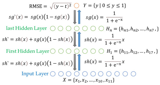 The cross entropy error (CEE) has higher accuracy than the root mean squared error (RMSE) when selecting one of several output nodes as the correct answer, but the BPCS has only one output node [30]. The value of the output node is important; so, the RMSE is used as a loss function. Equation (9) shows a computation method of the RMSE.