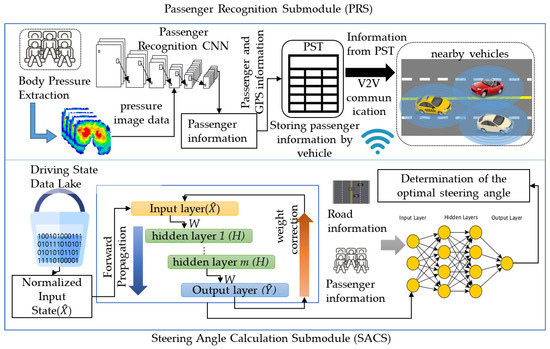 The passenger condition of the vehicle must always be considered for the safety of the vehicle. In particular, fully autonomous vehicles need to calculate optimal driving not only for normal driving but also for emergency situations. In such an emergency situation, the vehicle should set a direction to minimize human casualties; it is very important to understand the passenger status of the surrounding vehicles to minimize human casualties [31,32]. Therefore, for this paper, we designed the passenger recognition and sharing module (PRSM), which calculates the optimal steering angle that can minimize damage in emergency situations by detecting the passenger status of the driving vehicle itself and surrounding vehicles. The PRSM consists of two submodules. The passenger recognition submodule (PRS) generates a training data set using generative adversarial networks (GAN) [33] based on the data of people directly seated on the body pressure sensor and designs a passenger recognition CNN (PRCNN) to identify luggage, adults, and children. The steering angle calculation submodule (SACS) computes the optimal steering angle while driving according to the passenger status, driving route, and driving situation of surrounding vehicles. Figure 4 shows the overall concept of the PRSM.