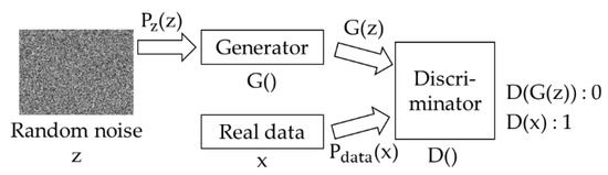 The GAN is an artificial intelligence model that uses unsupervised learning to generate image data. Figure 5 shows the simple configuration of the GAN. In Figure 5, the generator generates new image data using the samples Pz(z) and G(z) extracted from noise and delivers the generated image G(z) to the discriminator. The purpose of the discriminator is to determine that G(z) is a fake image (that is, to output 0) and determine that Pdata(x) is a real image (that is, to output 1). The generator and discriminator are each a neural network model. Since the GAN is an unsupervised learning model, it learns using the entropy-based loss function rather than the label. When training is completed, the GAN creates a new image. Equation (10) shows the loss function of the GAN.