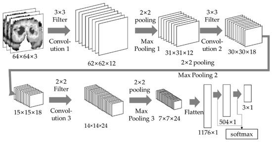 In the GAN, the learning proceeds in the direction where becomes the maximum while becomes the minimum. When the training of the GAN was completed, our work generated 150 images based on 58 images. At this time, the PRS trains the CNN model using these 208 images. The PRS classifies 64 × 64 images into three, R, G, and B, channels, uses 64 × 64 × 3 image data as input data, and decides whether it is an adult seat, a child seat, or cargo seat image. The PRS conducts a convolution and max pooling process three times. Since the input image is small, the stride of the PRS is explained as 1 to ensure accuracy. The PRS uses a 3 × 3 size filter in the first and second convolution processes and uses a 2 × 2 filter in the third convolution process. The first convolution process uses 12 filters, the second convolution process uses 18 filters, and the third convolution process uses 24 filters. The last layer of CNN, the fully connected layer, consists of a neural network with one hidden layer. Figure 6 shows the overall structure of the CNN used in the PRS. The PRS recognizes the current seat state through the CNN and creates a passenger state table (PST) that stores the overall seat state of the vehicle. The PRS stores the current vehicle seat status and vehicle location in the PST and transmits the PST information to the surrounding vehicles through V2V communication. The PRS represents the information of up to 15 seats in an array. Algorithm 1 shows that the PRS stores the seat information in the array and sends it to the PST.
