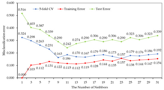 First, this work conducted a simulation to find K suitable for the RRCS. For the simulation, 312 data sets were used, of which 62 sets were used as test data sets and the remaining 250 sets were subjected to five-fold cross validation. Figure 7 shows the misclassification errors of the RRCS.