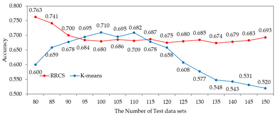 Second, to verify the accuracy of the RRCS, the accuracy of the K-means clustering algorithm trained with the same training data and that of the RRCS were compared. The RRCS was trained using 200 training data sets, and the RRCS and K-means algorithms were tested using 150 test data sets. Figure 8 shows the accuracy when the test data sets are input to the RRPS and K-means clustering algorithms. According to the result of the simulation, the average accuracy of the RRCS was 0.693 and that of the K-means algorithm was 0.627. Because the K-means algorithm classified unlabeled data into eight clusters, it showed higher accuracy than the RRCS when classifying a constant amount of data but failed to classify between clusters as the amount of data increased. Therefore, the RRCS is more suitable than K-means algorithm to classify road roughness.