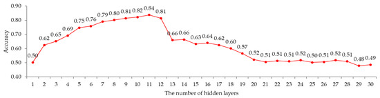 Next, this work examines the accuracy of the BPCS according to the number of hidden layers in order to obtain the number of hidden layers suitable for the BPCS. In this paper, the BPCS was trained using 253 training data sets while fixing the number of nodes of the hidden layer to seven and increasing the number of hidden layers of the BPCS from 1 to 30. Figure 9 shows the accuracy of the BPCS according to the number of hidden layers.