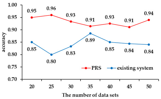 For the simulation, it was carried out by increasing the data set from 20 to 50, and the proportion of the cargo was increased each time the amount of data was increased. Table 7 shows the number of pieces of cargo included in the data set, and Figure 10 shows the accuracy of the PRS and the existing system for each data set.