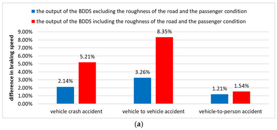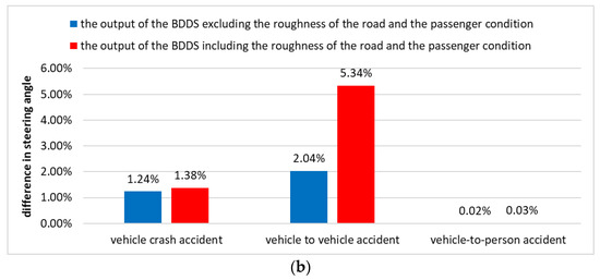 Finally, in order to verify the effectiveness of the BDDS, this work compared the actual accident data, the output of the BDDS without road roughness and passenger status, and the output of the BDDS with road roughness and passenger status. This experiment represented the average of the difference between the output of BDDS and the actual accident data in 171 vehicle–object accidents, 483 vehicle–vehicle accidents, and 550 vehicle–person accident items of data. The actual data used for the simulation contained at least one death. Figure 11a shows the difference in braking speed according to road roughness and passenger conditions, and Figure 11b shows the difference in steering angle.