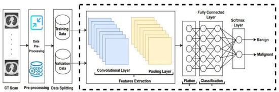 In [22], the researchers applied the LeNet-5 model to classify benign and malignant pulmonary nodules in thoracic CT images. Lung Image Database Consortium and Image Database Resource Initiative (LIDC-IDRI) datasets were obtained for the experimental results. The 10-folder cross-validation was implemented to evaluate the model classification. The LeNet-5 achieved 97.041% accuracy in classifying benign and malignant nodules and 96.685% accuracy in classifying mild malignancies and serious malignancies. Another study [23] presented a hybrid version of a convolutional neural network for the classification of pulmonary nodules based on LeNet and AlexNet. The hybrid framework used LeNet’s layers and parameters of AlexNet. A total number of 1018 CT images was obtained from the LIDC-IDRI dataset to train and evaluate the agile convolutional neural network. Various parameters such as kernel size, batch size, learning rate, and weight initialization played an important role in achieving high accuracy. The framework achieved 0.822 accuracy and 0.877 area under the curve, with the kernel size set to 7 × 7, the batch size at 32, and the learning rate at 0.005. Gaussian and dropout were also applied in this work.