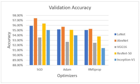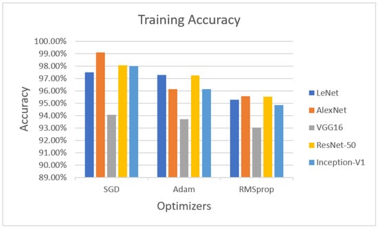 In the training phase, the accuracies of LeNet, AlexNet, VGG16 ResNet-50 and Inception-V1 with the optimizers are illustrated in Figure 2. LeNet with the SGD optimizer achieved 97.47% accuracy, whereas AlexNet with the SGD optimizer obtained 99.09% accuracy. VGG16 with the SGD optimizer achieved 94.07% accuracy. ResNet-50 with the SGD optimizer obtained 98.05% accuracy, while Inception-V1 with the SGD optimizer achieved 97.99% accuracy.
