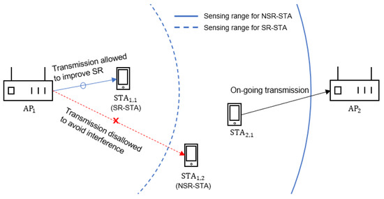 Figure 2 illustrates an operational example of the DCA scheme. Here, denotes the j-th STA associated with . In Figure 2, and are associated with and classified as SR-STA and NSR-STA, respectively. Assume that is transmitting a data frame to . During the transmission time of , can continue the backoff procedure for , but not for because does not detect the transmission of with , but detects it with . Consequently, can transmit to SR-STA () and the exposed node problem can be alleviated. Notably, in addition to the enhancement of SR, the DCA scheme is effective for reducing transmission failure due to interference. In this example, the DCA scheme prevents from transmitting to NSR-STA () for the transmission duration of .
