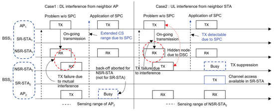 Figure 3 shows how the SPC scheme can decrease the number of transmission failures of NSR frames and suppress the transmissions of interfering neighboring nodes. Here, we consider that two BSSs are partially overlapped, and each BSS consists of an AP, one SR-STA, and one NSR-STA. Moreover, we consider two cases: Case 1, in which transmission of the NSR frame is subjected to interference from a neighboring AP, and Case 2, in which interference occurs because of a neighboring NSR-STA.