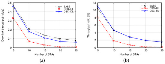 We define and as the DL and UL throughputs achieved by the AP and all STAs in the central BSS, respectively, and as the total throughput, that is, . Moreover, we define as the ratio of DL throughput to total throughput, that is, . Figure 5 shows and when the distance between APs () was 80 m and the number of STAs per BSS () was increased from 5 to 25. Owing to severe interference in the dense OBSS environment, the asymmetric properties of channel access and DSC algorithm between the DL and UL transmissions, decreased sharply as increased, and did not exceed 5% in most cases. The problem of DL throughput degradation deteriorated in DSC-UL. Compared to BASE, decreased several times in DSC-UL, and was lower than 2%, except in the case when = 5. This was because the AP was further deprived of DL transmission opportunities, especially when the DSC algorithm was applied only to the STAs for UL transmission. This problem was somewhat alleviated in DSC-DL, and and were comparable to those in BASE. However, decreased from 11% to 1.5% when increased from 5 to 25. These results confirm that the DL throughput is degraded significantly in dense WLANs, and it is critical to solve this problem.
