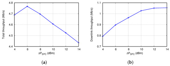 Effect of additional transmission power in the supplemental power control scheme () on (a) total throughput and (b) downlink throughput.
