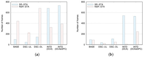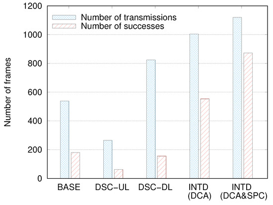 We can analyze how INTD(DCA&SPC) improved the DL throughput by observing the number of frames transmitted by the AP () and the number of frames successfully delivered to the STAs (). Figure 8 compares and for several mechanisms. Among all of the mechanisms, was the least in DSC-UL, and it was approximately half that in the BASE case. In the DSC-DL case, increased remarkably, and it was higher than those in the DSC-UL and BASE cases by approximately 3.1 and 1.5 times, respectively. These results verify that DSC-UL is biased toward UL transmission, and this bias is greatly alleviated in DSC-DL. However, the value of in DSC-DL was considerably smaller than that in the BASE case, which implies that although DSC-DL is helpful for increasing the number transmission attempts for DL frames, it hardly ensures their successful transmissions. Rather, it causes more frequent transmission failures because of serious interference.
