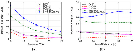 - INTD(DCA): The proposed DCA scheme is implemented in the APs for differentiated DL transmissions to SR-STAs and NSR-STAs. The DSC algorithm is also implemented in the same way as that in the DSC-UL mechanism.