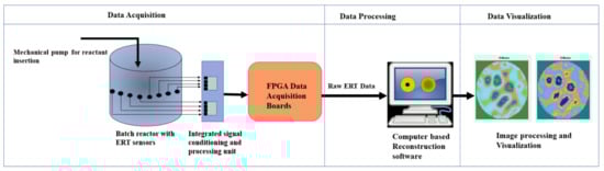Figure 2 depicts the ERT setup schematic around a reactor tank. This setup can be categorized into three modular components: data acquisition, data processing, and data visualization. The data acquisition component consists of ERT electrodes placed on the circumferential periphery of the reactor. The sensor array consists of 16 steel electrodes. These electrodes operate as emitters (source) as well as receivers (sink) for the electrical signals. The cables carry the electrical signals via field programmable grid array (FPGA) boards. The FPGA boards remove any electronic noise received, by implementing filtering algorithms as a pre-processing strategy. The data processing such as image reconstruction and image processing techniques can be applied to the incoming data in real-time or in offline mode. The resulting images are visualized and analyzed, and the signals are sent back to implement the control strategy in the reactor.
