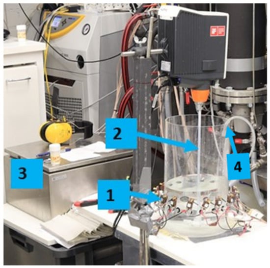 The rapid liquid-phase chemical reaction results in the formation of a non-conductive solid phase in the reactor. The initial solution volume inside the reactor was 3 L, as shown in Figure 3. The reagent addition volume was 0.4 L (feed pipe diameter was 2 mm). For all the investigated cases, (purity > 98%, Merck, Darmstadt, Germany) concentration was 1.6 , mixing speed was 100 RPM (tip speed of 0.37 ) and the feed addition rate was 40 mL. The aqueous was prepared by injecting gas (purity > 99.9%) into sodium hydroxide (NaOH, Purity > 98%, Merck) solution—a detailed experimental procedure is provided in [].