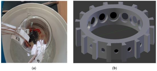(a) Jacketed beaker with supersaturated sucrose solution inside the ice bath (coaxial cables are numbered from 1 to 16); (b) 3D printed sensor insert, to mount the ERT electrodes.