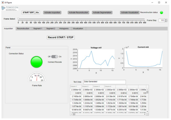 Four modules were implemented in the prototype software, in line with the data workflow in the ERT data acquisition and analysis system. These modules differed in their functions and were assimilated into separate tabs for better accessibility. In the current version of the ERT-Vis software, a researcher option has been added for enabling and disabling the four modules by pressing the activate push buttons in the general selection header strip. This saves time by reducing the number of computations required to update the displayed plots and images. With the “Activate Acquisition” button, the acquisition module tab is rendered functional. Using the “Activate Reconstruction” button, the reconstruction capabilities of the ERT-Vis software in the reconstruction tab are switched on. With the “Activate Segmentation” button, the image-processing capabilities from the MATLAB image processing toolbox are utilized to segment and process the data. With the “Activate Visualization” button, users have the capability to visualize the data in various available colormaps of the extracted individual RGB channels of the image, and can implement binarization on the extracted images by grey-level thresholding or flood-fill segmentation.