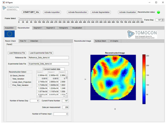 Finally, the importance of advanced visualization for fast industrial tomographic processes to analyze objects under consideration has increased to a significant extent [,]. Therefore, there is a need to develop comprehensive and easy-to-use graphical-user-interface-based software with functionality of data acquisition, image reconstruction, image segmentation, and solid concentration distribution visualization.