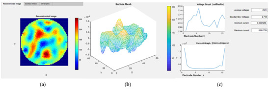The “Reconstruction” tab is vertically divided into two sections. This tab is activated after pressing the “Activate Reconstruction” state button. In the “Recon Check” tab of the reconstruction module on the left, the reference data and the experimental data can be imported using the push buttons “Load Reference File” and “Load Experimental Data File”, respectively. The file names of the imported experiment are displayed and verified in the Edit Text Field boxes “Reference File” and “Experimental Data File”, respectively. The reconstruction algorithm can be selected from the four options currently provided in the button group “Reconstruction Select”. The change in the selection of the “Reconstruction Select” button group results in the generation of a new image in the “Reconstructed Image” tab on the right-hand side. The numerical edit text fields “Current Frame Number”, “Data per Measurement”, and “Number of Frames” display the current frame monitored, data points in the single measured frame, and the total number of frames in the current experimental dataset, respectively. In the right-hand side section, as shown in Figure 7, the 2D reconstructed image is observed in the “Reconstructed Image” tab; this provides us with a 2D visualization. In the “Surface Mesh tab”, a 3D surface mesh provides a 3D visualization. Information regarding the induced voltage stability using the average and standard deviation of the voltages in the frame can be observed numerically in the “VI-Graphs” tab. Information regarding minimum and maximum current in the frame is also observed in this tab, to check the sensor capabilities for detecting the currents in the solution provided.