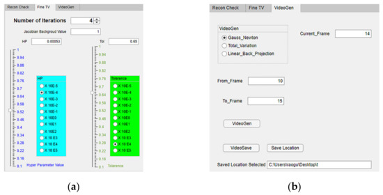 Additionally, the reconstruction algorithm “Total Variation” can be controlled from the “Fine TV” tab on the left axes as shown in Figure 8a. Here the number of iterations varies according to the spinner “Number of Iterations”. The Jacobian background value can be edited using the numerical edit field “Jacobian Background Value”. The hyper-parameter value and tolerance can also be varied from 1 × 10−5 to 1 × 105 with the help of the separate sliders and the multiplication factor selected from the button group. They are color-coded blue and green for easy access. The values set are visible in the numerical edit field boxes “HP” and “Tol”, respectively.