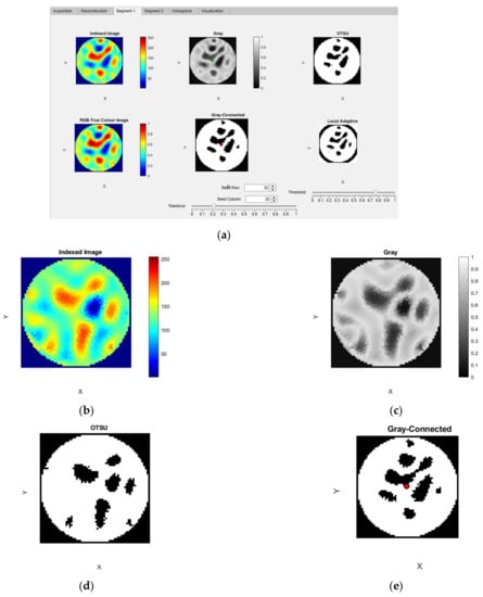 In this module, there are two tabs for segmenting the reconstructed ERT image with crystal regions. In the “Segment 1” tab there are six panels, as shown in Figure 9. The output of the EIDORS software provides an indexed image which is mapped onto a ’jet’ colormap and displayed in the “Indexed Image” panel. This indexed image is converted to an RGB true color image using the function mat2im() []. The converted true-color image is visualized in the “RGB-True Color Image” panel. The indexed image is converted into a gray image using the MATLAB inbuilt function rgb2gray(). This resulting image is displayed in the “Gray” panel. OTSU segmentation is applied to this gray image using the MATLAB function otsuthresh() after evaluating the histogram using the function imhist. The resulting image is shown in the “OTSU” panel. The “Gray-connected” panel, displays the result from the flood-fill image segmentation performed using the function grayconnected() MATLAB function. This is an interactive segmentation method where the user provides interactive input. Three inputs are required for this segmentation to operate: The row number, the column number and the tolerance. The row and column input for the initial seed point are applied using the spinners “Seed Row” and “Seed Column” within the range of 0 to 64. The tolerance for the range of gray levels can be controlled within the range 0 to 1 using the slider “Tolerance” below the axis. In the “Local Adaptive” panel, the results from the MATLAB image segmentation function adaptthresh() are visualized. The threshold value for the binarization is controlled using the slider “Threshold” below the axis. In Figure 9a, the Segment 1 tab can be observed with six image displays showing results of various image processing algorithms. Figure 9b–e shows the resultant reconstructed images application of image processing algorithms.