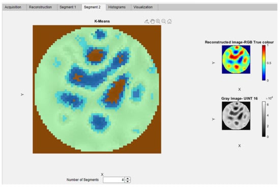 The ERT reconstructed image and 16-bit unit gray image can be visualized in the respective panels. The 16-bit gray image is obtained using the MATLAB function im2uint16. The Uint16 image is used to implement the K-means clustering. The spinner “Number of Segments” provides the input values for classifying the image into the various clusters. This provides the flexibility to classify and extract the cluster region of interest for further analysis and study. Different clusters are automatically color-coded for better visualization.