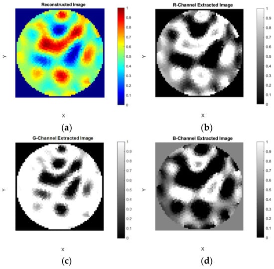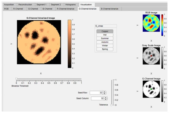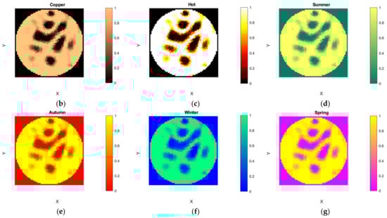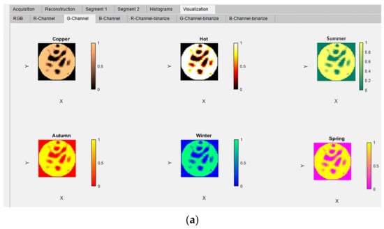 The ERT-reconstructed RGB true-color images were extracted into the three separate images and displayed in these panels using the MATLAB function imsplit. The extracted channels have been mapped to six different MATLAB colormaps; copper, hot, summer, autumn, winter, and spring []. These six colormap images are simultaneously displayed in six panels in the “R-Channel”, G-Channel, and “B- Channel” tabs. The titles of panels correspond to the names of the colormaps: “copper”, “hot”, “summer”, “autumn”, “winter”, and “spring”, as shown in Figure 12a–g.