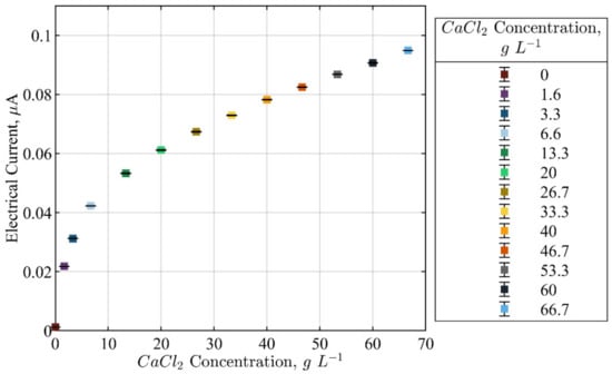 The evaluation of the changes in electrical current due to the changes in the concentration of calcium chloride in the solution was tested. Figure 15 shows the changes in the average electrical current from 0 gL−1 to 66.7 gL−1. It was noted that the current changed from 0.02 µA to 0.1 µA. These tests proved that the FPGA signal conditioning units of the ERT device could resolve minor conductivity changes in highly conductive solutions involving calcium chloride.