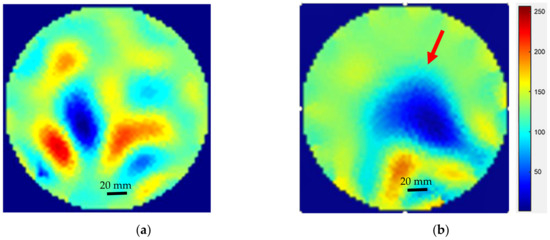 Further tests using ERT-Vis software were conducted to evaluate the detection of calcium carbonate CaCO3 inside the reactor. For this purpose, the VideoGen tool was used and the images were saved. The images prior to the addition of any crystal additives consisted of noise due to motion of water and the amplification of minor differences by the Gauss-Newton reconstruction algorithm, as shown in Figure 16a. Powdered calcium carbonate weighing 100 g (VWR, purity > 99%) was put inside the reactor and the images were reconstructed using the Gauss-Newton algorithm. The changes in the reactor were visible and the color of the reactor turned opaque. The solid microparticles of calcium carbonate appeared as a non-conducting region, as shown in Figure 16b.
