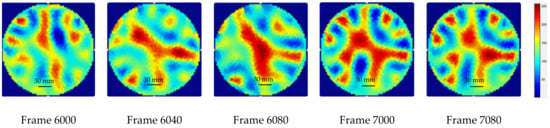 Initially, a metallic impeller was utilized in the experimental setup. The reconstructions with the metallic impeller included significant noise during the acquisition of ERT signals. Therefore, a plastic-fabricated Rushton impeller was utilized for agitation. Using the ERT-Vis software, detection and resolution of the noise issue in reconstructed images were swiftly resolved, which optimized the overall time required for experimentation. Quick analysis prior to the start of the experiments provided us with an added advantage in performing closed-loop control experiments [].