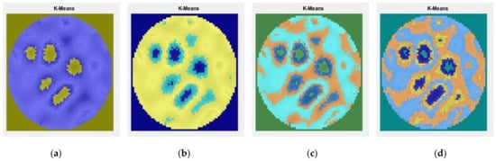 To determine the calcium carbonate presence in the solution using the unsupervised learning method, K-means clustering segmentation was implemented. Figure 18a–d shows the effects of changing the number of clusters in the image to two, three, four, and five clusters.