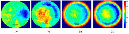 The results for temperatures from 90 °C to 18 °C are presented in Figure 19a–d. It can be seen that at 90 °C, the measurements showed a certain discontinuous region inside the reactor. These regions indicate the onset of crystallization over the electrodes. At 45 °C, some low conductivity regions were visible, but the reconstructed images had significant noise. At 40 °C and 35 °C the sensors were completely blocked by crystal formation over the electrodes and no electrical signal could pass through.